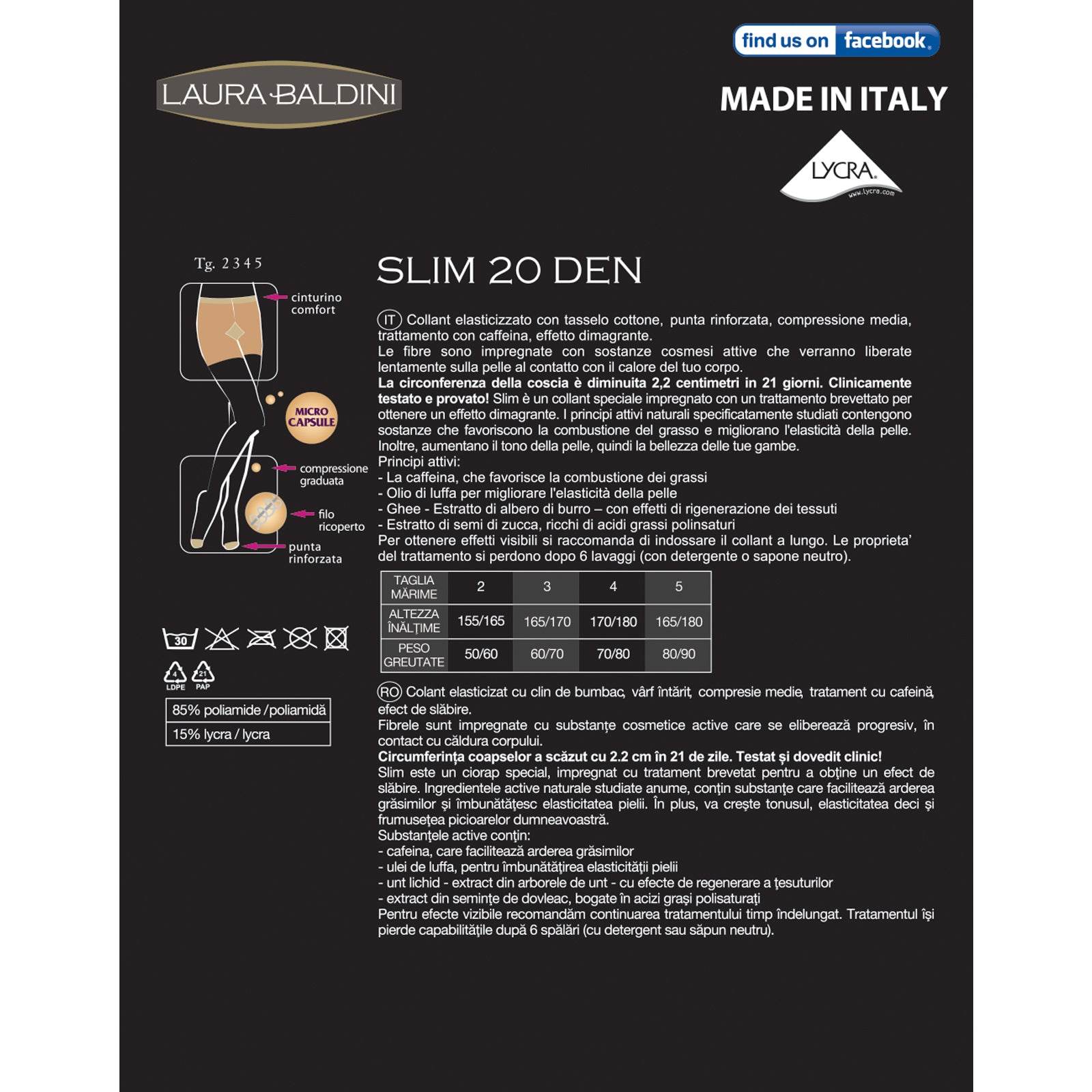 Slim este un ciorap special, impregnat cu tratament brevetat pentru a obtine un efect de slabire. Ingredientele active naturale studiate anume, contin substante care faciliteaza arderea grasimilor si imbunatatesc elasticitatea pielii. In plus, va creste tonusul, elasticitatea, deci si frumusetea picioarelor dumneavoastra.