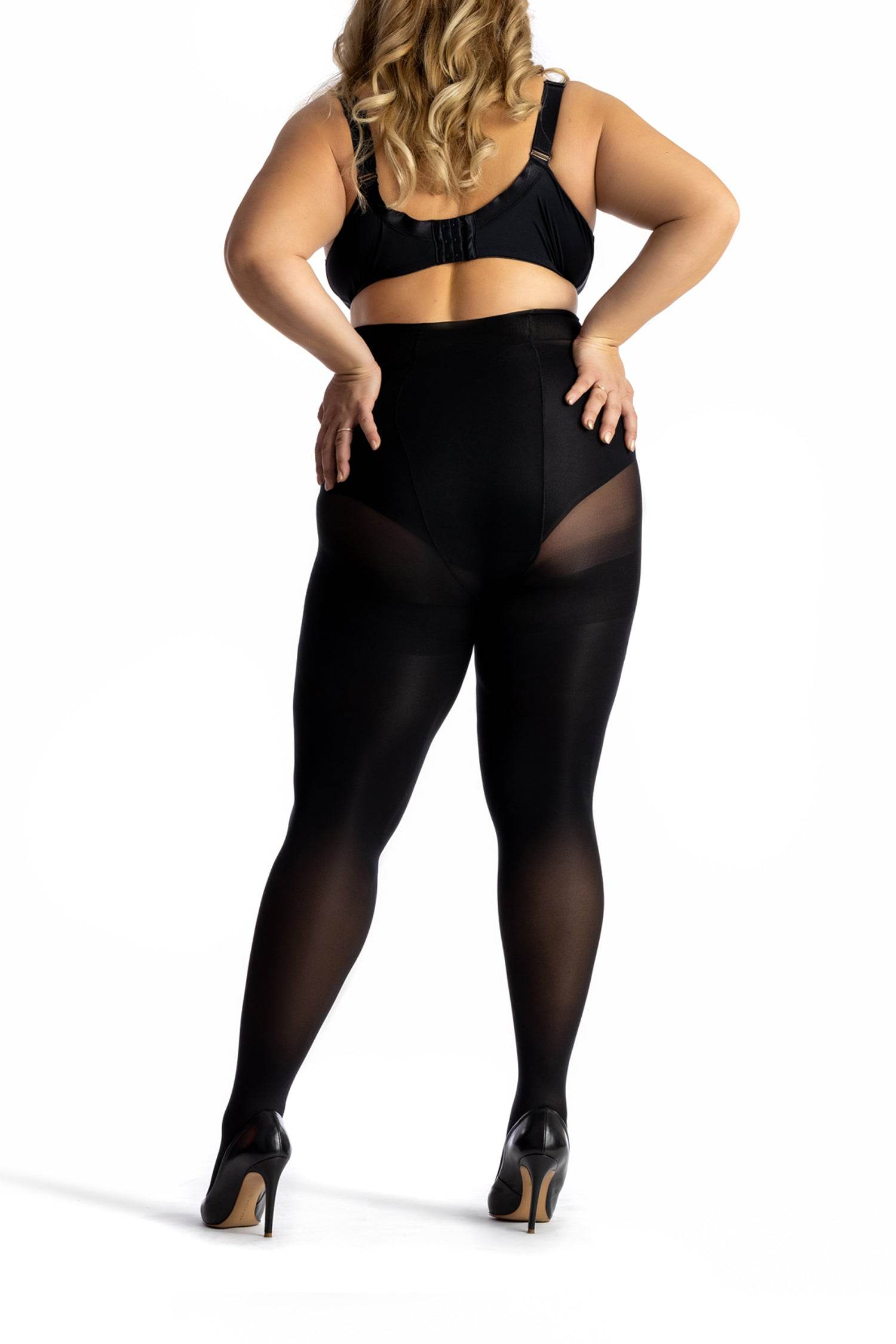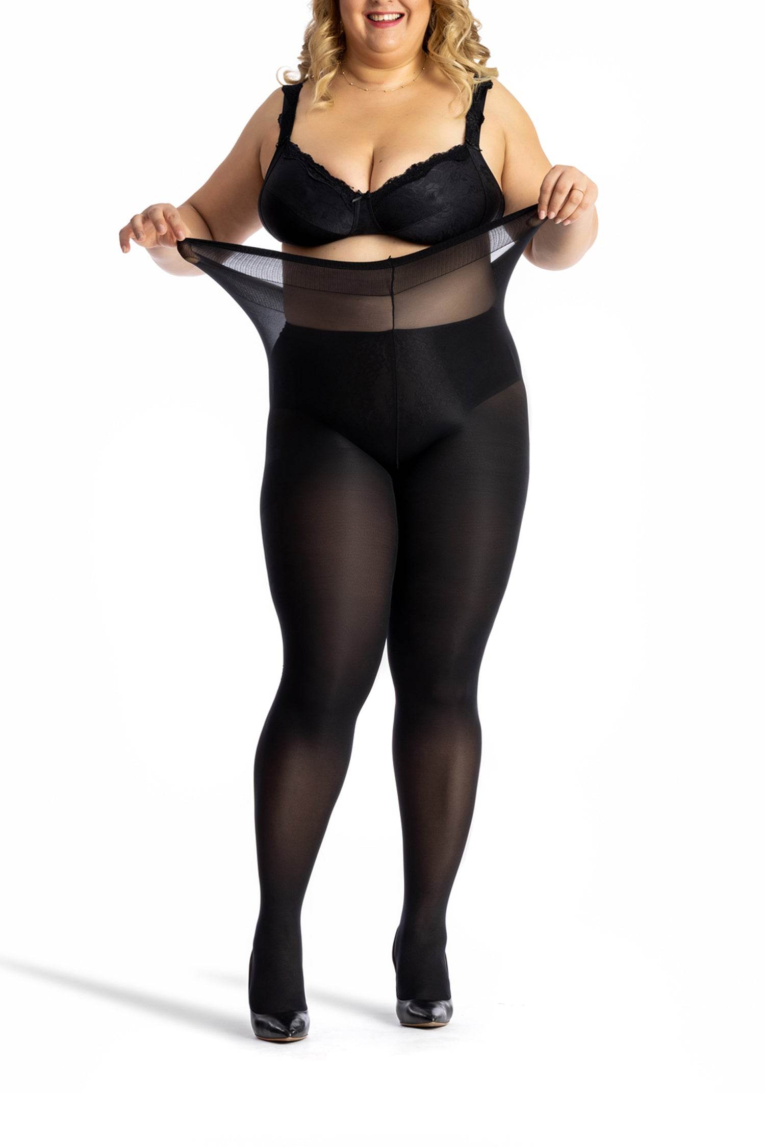 Dres opac din microfibra 100 den pentru marimi mari, varf intarit, cu banda dorsala de 7 cm la marimea 3XL. Este special creat cu chilot confortabil cu talie inalta si are o banda anti-frecare in jurul coapselor, pentru a uita de disconfortul frecarii picioarelor.
