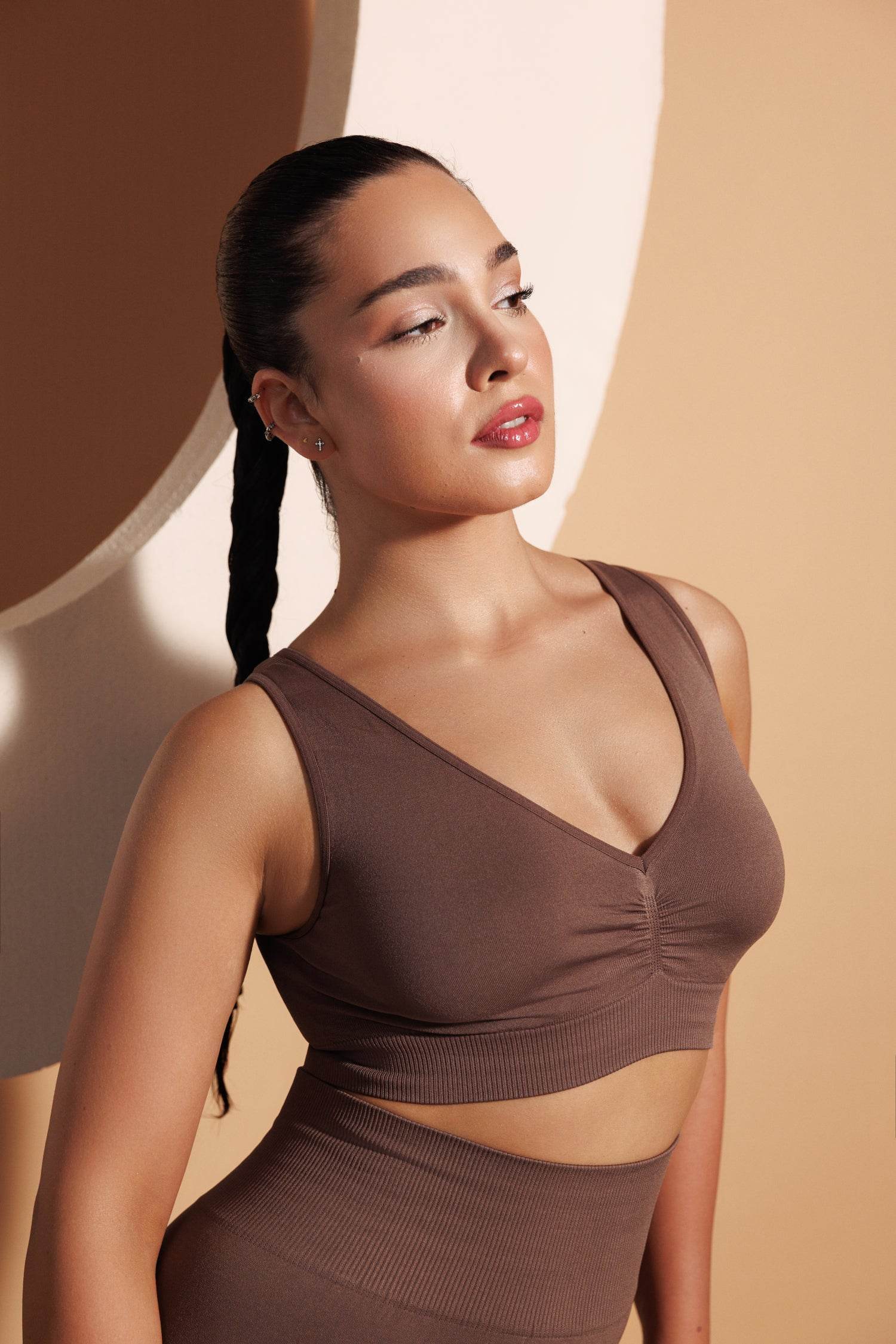 Bustiera elastica din microfibra, cu decolteu in V se muleaza pe corp, ofera sustinere si confort, fiind potrivita pentru orice activitate fara sa restrictioneze miscarile. Microfibra este un material cunoscut pentru capacitatea de a evacua transpiratia, mentinand pielea uscata in timpul efortului. Designul minimalist o face ideala pentru sport, yoga, fitness sau relaxare.