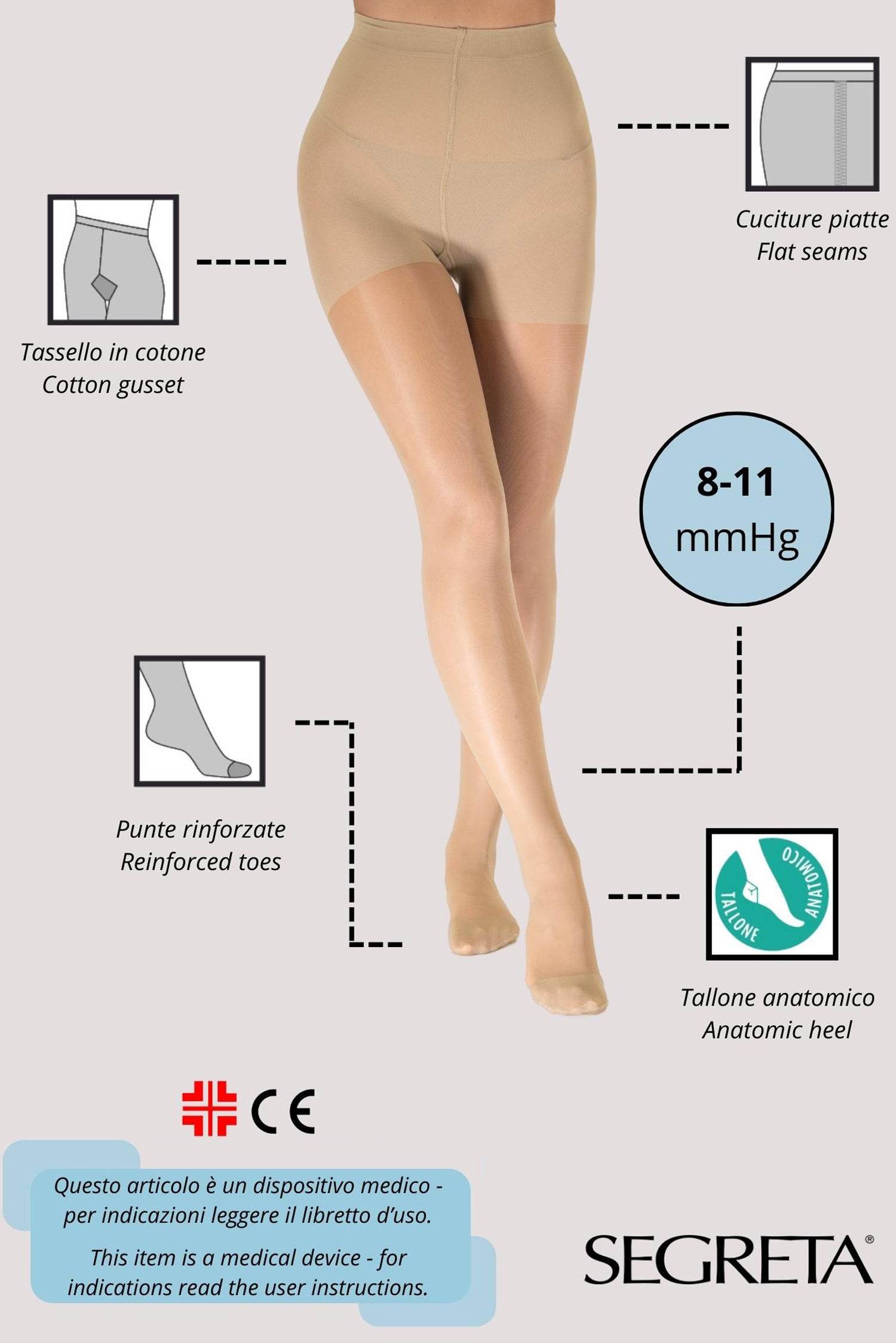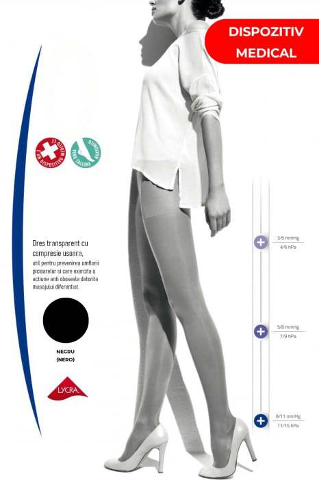 Dres medicinal transparent cu compresie usoara 8/11 mmHg, 11/15 hPa, util pentru prevenirea umflarii picioarelor si care exercita o actiune anti oboseala datorita masajului diferentiat. Compresia ajuta la imbunatatirea circulatiei sangelui, reduce oboseala si umflarea picioarelor si previne aparitia varicelor. Dresul este recomandat persoanelor care petrec mult timp in picioare si care sufera de picioare obosite.